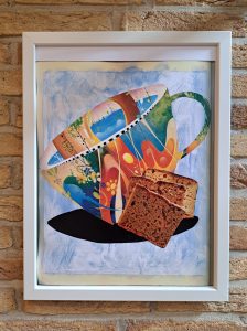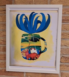 Zij heeft schilderwerk met verf en krijt opgehangen, maar is ook zeer actief met het maken van collages.